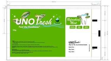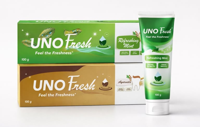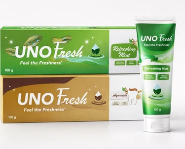 UNO FRESH is a toothpaste brand developed for the Russian market, positioned as a natural, India-origin oral care product. The project involved designing a distinctive brand identity and packaging system for multiple toothpaste variants, while ensuring strong shelf presence and market differentiation. The scope of work included logo design for brand registration and packaging design for sales presentation and future production. The brand needed to communicate freshness, effectiveness, and trust, while subtly highlighting its herbal and natural Indian roots in a contemporary, dynamic visual language suitable for an international audience.